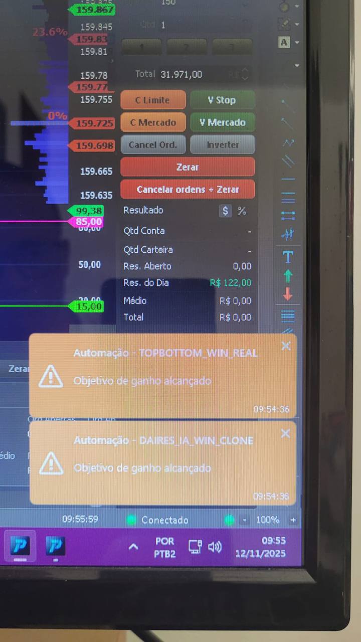 O Bot TopBottom é um sistema automatizado de alto desempenho para operações nos mercados de mini índice (WIN) e mini dólar (WDO). Com identificação precisa de zonas de reversão, ele executa operações estratégicas com gestão de risco rigorosa. A performance média pode gerar cerca de R$150 por dia, alcançando até R$3.000 mensais, proporcionando consistência e eficiência ao trader.